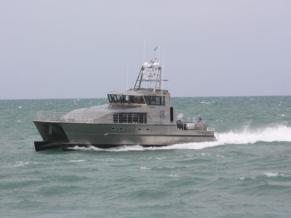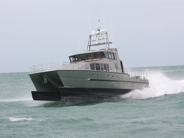 This updated patrol catamaran includes our new Sickle Bow for improved seakeeping performance.