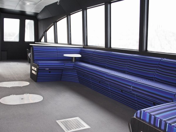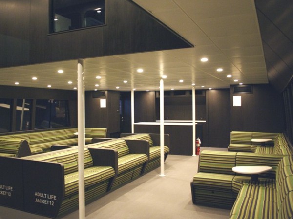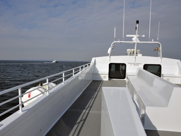 The upper deck will feature open air seating as well as standing room for passengers to enjoy the views. Both vessels incorporate many eco-friendly components. Green features include the propulsion systems consisting of Caterpillar C18 ACERT engines fit with specialized CleanAIR Permit filters to reduce harmful emissions by up to 99%. Noise pollution will be mitigated with acoustic foam insulation and critical grade mufflers. The cabin interiors will be finished with recyclable aluminum honeycomb wall panels and recyclable aluminum ceiling panels with acoustic insulation.