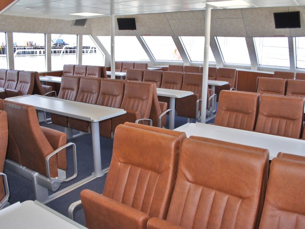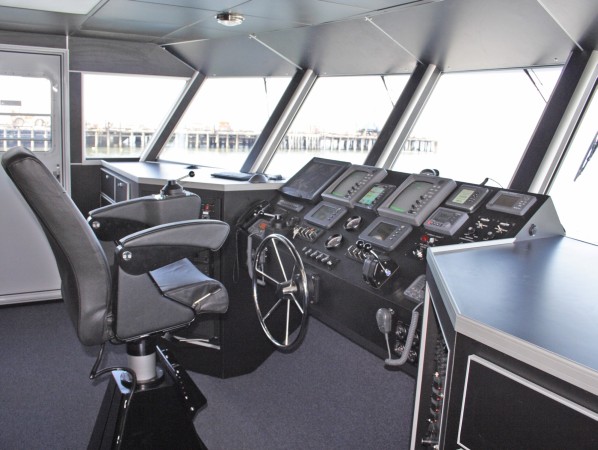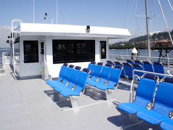 Onboard the vessel passengers are indulged in the spacious comfort of a twin deck cabin. Each row of cabin seats faces a dining table and each seat folds up for very easy passengers access right along the row. The vessel is highly accessible with wide aisle ways, low clearance door sills, and an exterior ramp that sweeps up to the fore deck allowing all passengers easily access to the viewing areas. Large windows located throughout the cabin provide spectacular visability from inside the vessel and there is a fully equipped galley onboard complete with multiple refrigerators, freezers, sinks and ovens to cater for lunch and snacks whilst underway. On the upper deck there is an observation area with outdoor seating and on the main deck is a wrap around exterior walkway protected by a rain shelter. Teknicraft is currently finished the third sister ship for Kenai Fjords Tours, Aialik Voyager.