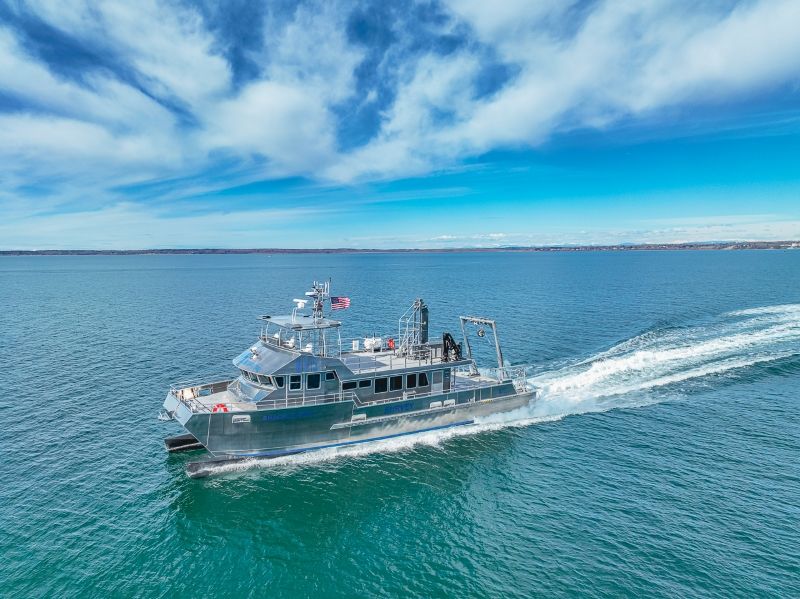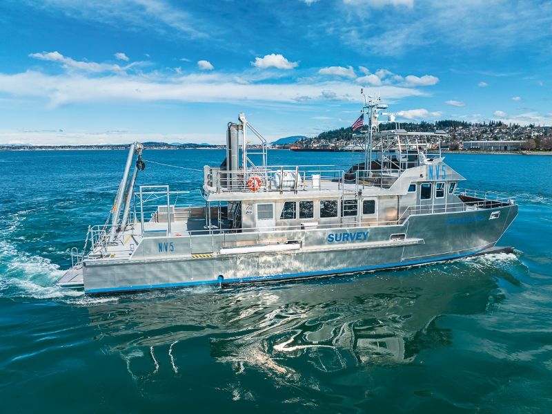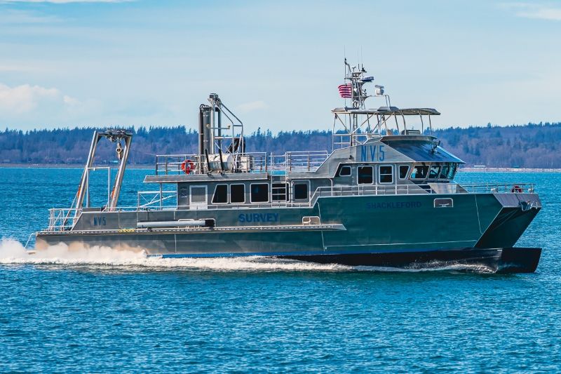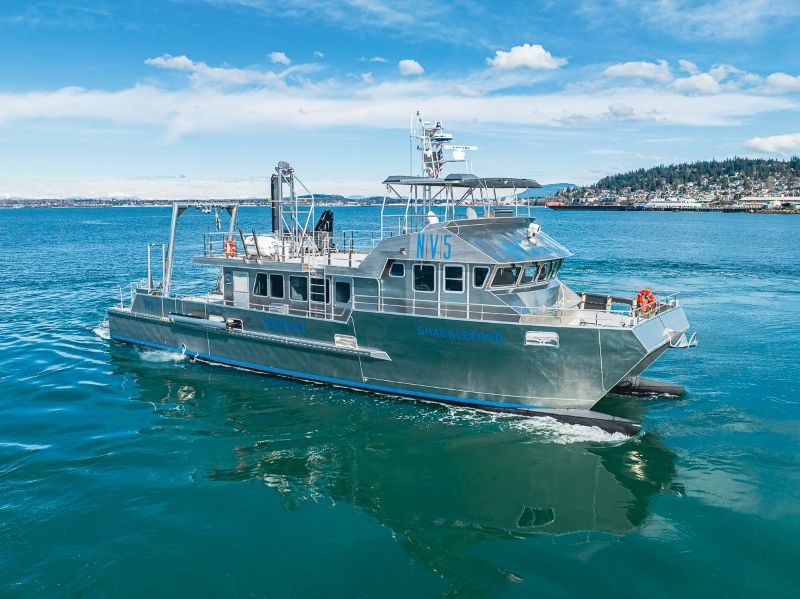 R/V Shackleford leverages the fundamental, and proven design elements of the Duke University Marine Lab’s R/V Shearwater and Blue Tide Puerto Rico’s R/V Blue Manta which have proven to be highly successful in their near-coastal research environments. The vessel was sea-trialed on Bellingham Bay, prior to being transported via cargo ship to its homeport of Beaufort, NC.
