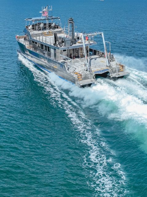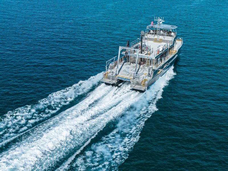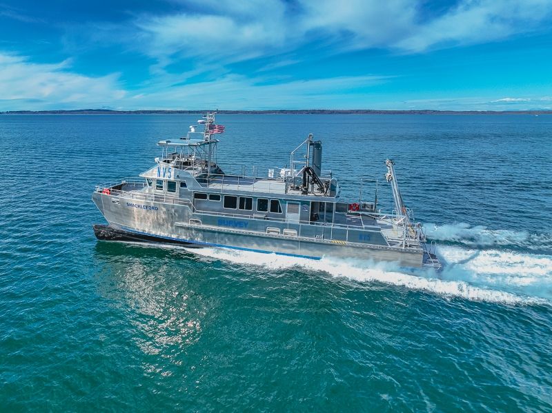 The R/V Shackleford is a 22 m medium speed aluminium catamaran hull with a pair of C18 engines and fixed pitch propellers.